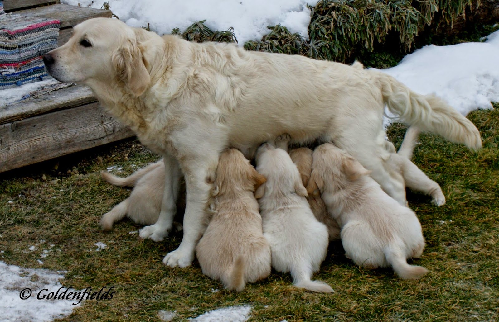 Heute sind unsere kleinen Flegel 6 Wochen und es wird Zeit die große Welt zu entdecken. Der Sturm hat nachgelassen und es gab herrliches Winterwetter. Ab in den Garten, aber zuerst braucht man natürlich "wieder" mal eine Stärkung von Mama Lissy.