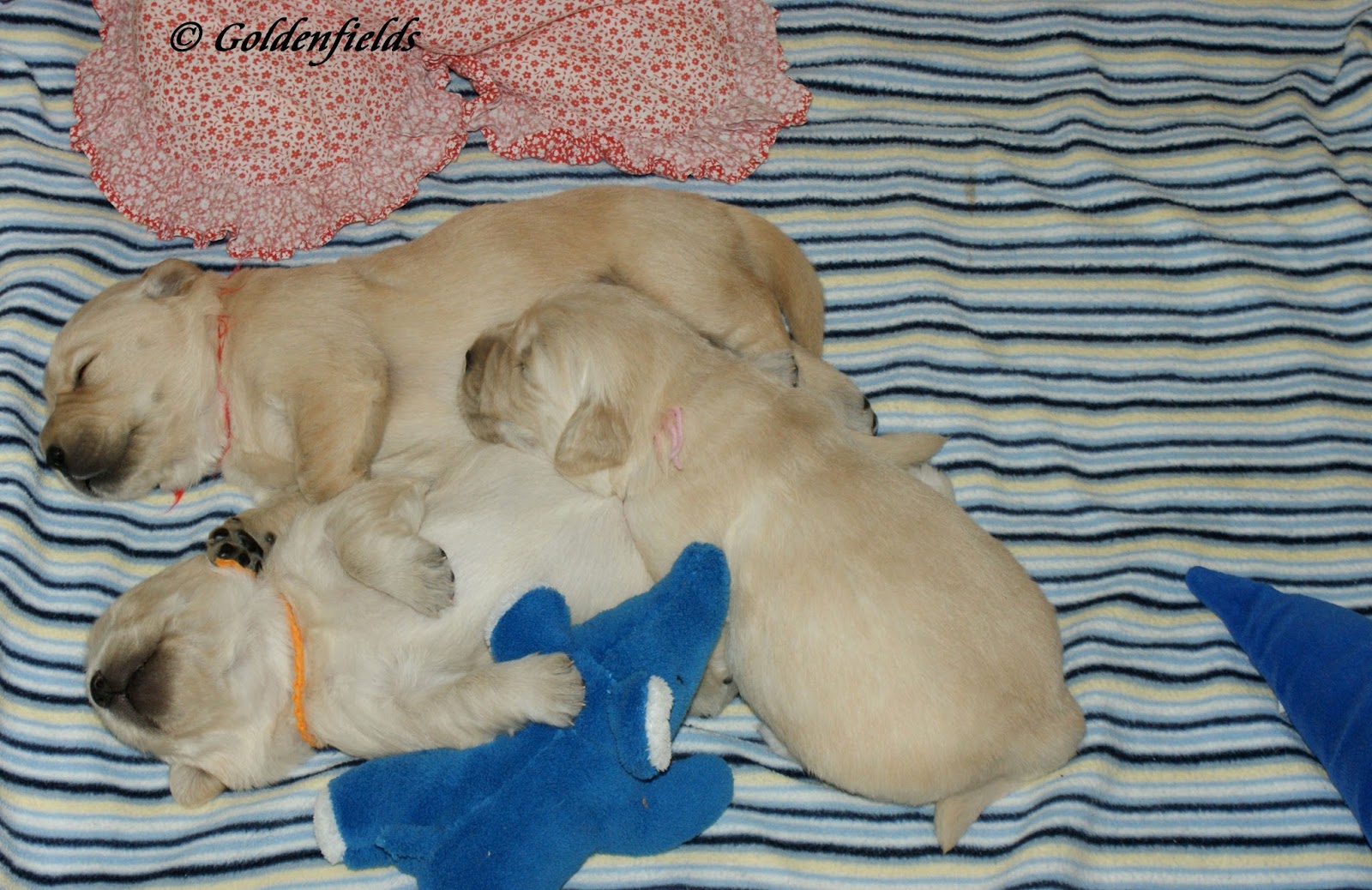 Die junge Tony kam genau zu Weihnachten von einem größeren Züchter zu uns, da sie dort von den Labradors als einfühlsamer Goldie nicht respektiert wurde und sogar unter dem Auge und an der Schlagader gebissen und verletzt wurde.Vom ersten Tag an, hat sich Tony bei uns und unserm
