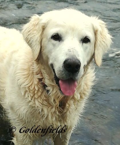 "Devina of Golden Fields"ist auch eine nach wie vor fitte Hündin, die täglich viel Spass mit Kindern und anderen Hunden auf ihrem Reiterhof hat.